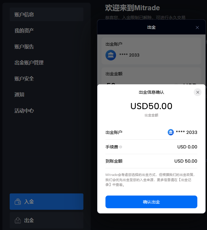 确认你要出金的数额后,点击“确认出金”就可以了。